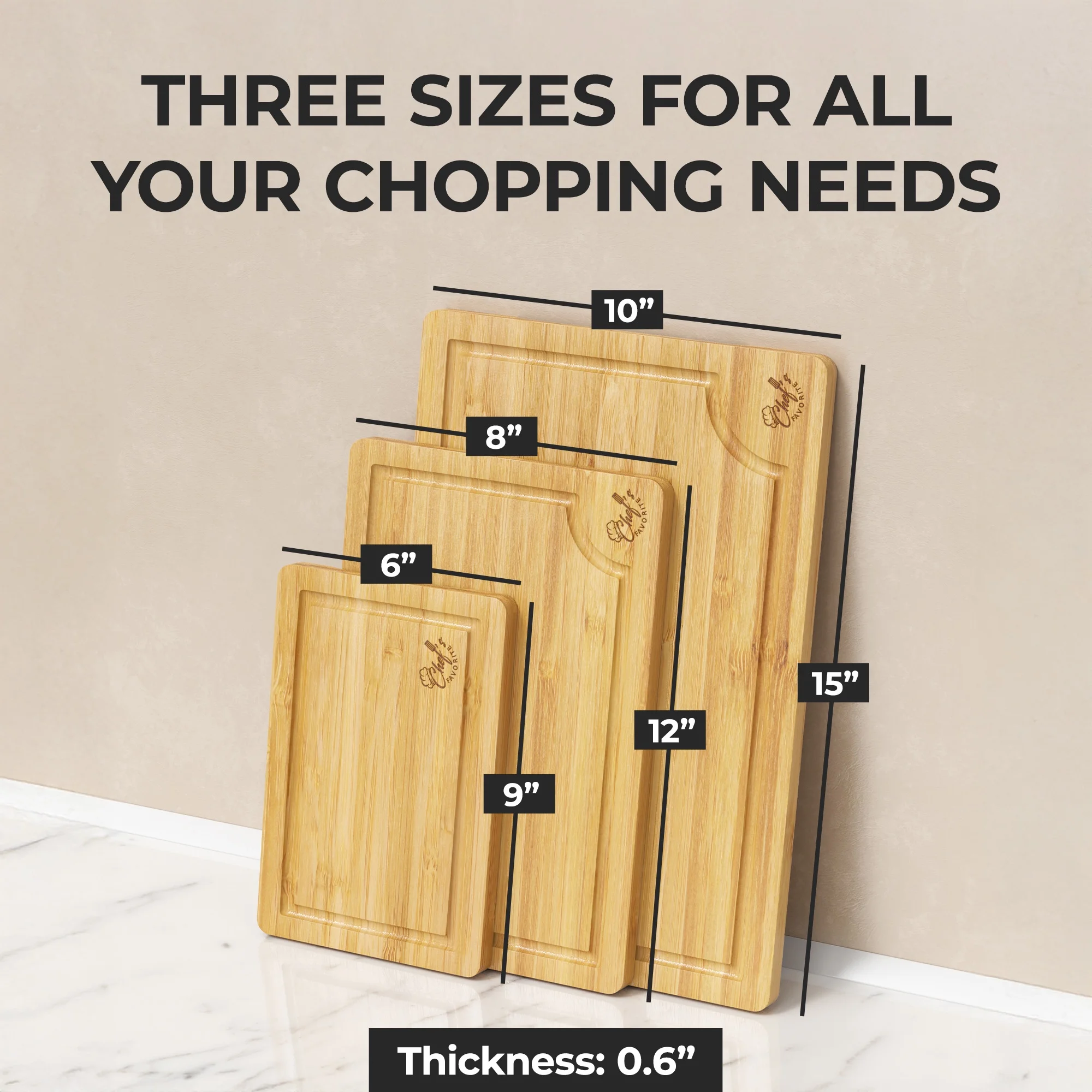 Chef’s FAVORITE Bamboo Cutting Board Set of 3 – Pre-Oiled, Double-Sided Boards with Juice Grooves – Large, Medium & Small – Built-in Handles – Mess-Free Chopping for Kitchen Prep