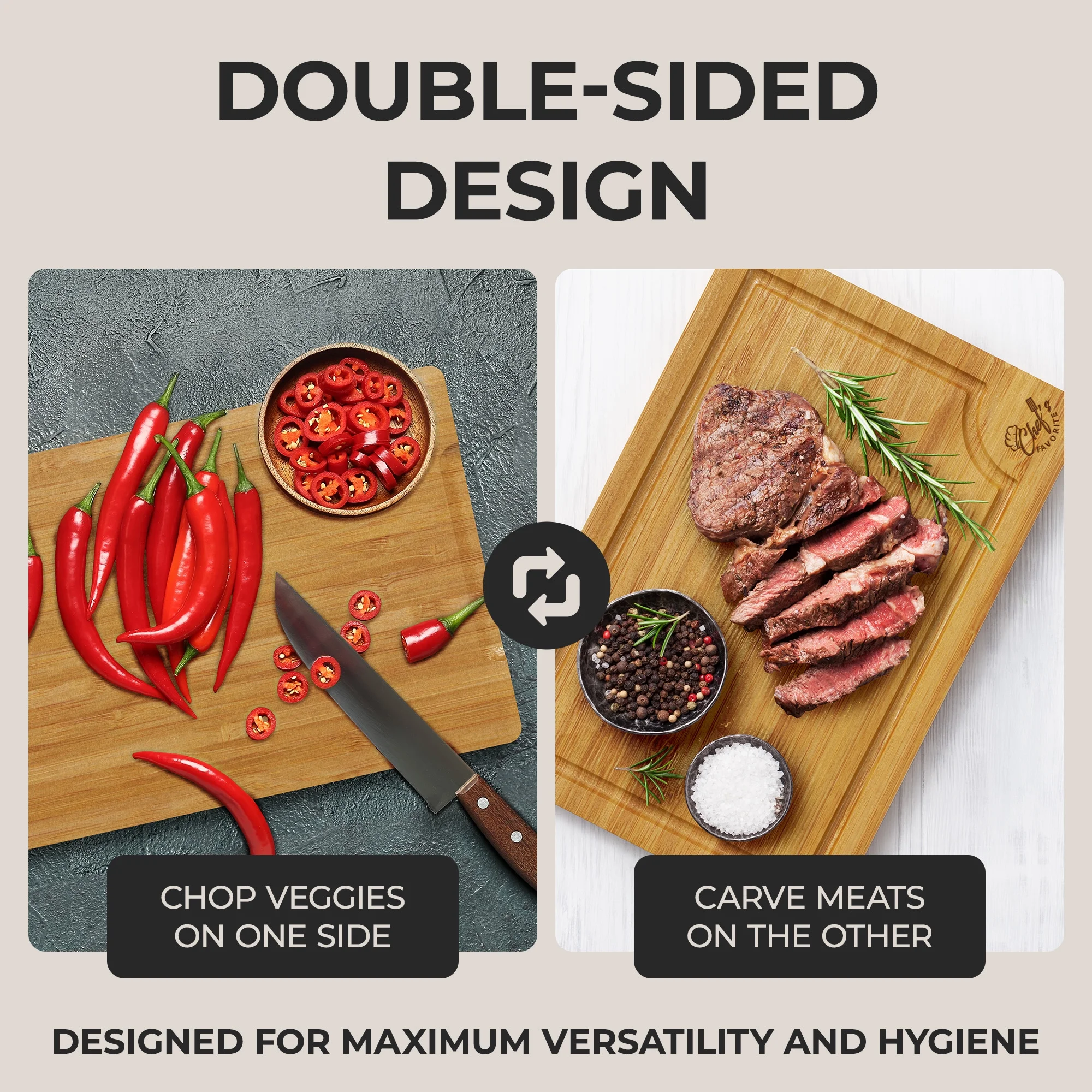 Home Cutting Board Chef’s FAVORITE Bamboo Cutting Board Set of 3 – Pre-Oiled, Double-Sided Boards with Juice Grooves – Large, Medium & Small – Built-in Handles – Mess-Free Chopping for Kitchen Prep