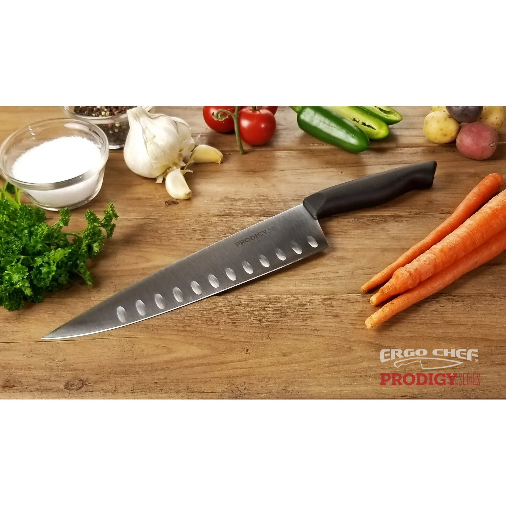 This 10-inch Ergo Chef Prodigy Series chef’s knife is a versatile and durable tool for the kitchen. Crafted from high-carbon stainless steel with a precision-sharpened 18-degree edge, it effortlessly cuts through large vegetables, fruits, meats, and cheese. The ergonomic Santoprene handle provides a secure, non-slip grip, while the hollow ground blade reduces sticking and promotes smooth, efficient slicing. Designed to handle both big and small tasks, this razor-sharp knife is an essential addition to any home or professional chef’s collection.